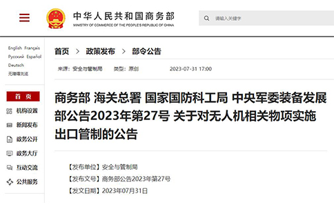 2023年7月31日,四部門聯合發布了關于無人機的兩個公告,分別對部分無人機專用的發動機、無線電通信設備以及重要搭載,還有民用反無人機系統等實施出口管制。對于消費級的...
