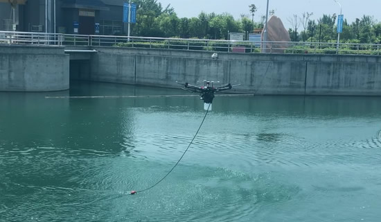 傳統的水體監測,如果取水樣本在離河流、湖泊岸邊較遠的位置,通常需要乘坐小型船舶到達取水位置,效率低、風險大、成本高。無人機通過搭載啟飛應用開發的無人機取水模塊,結合地面站系統可以在多個指定 GPS 坐標水域進行水體取樣,安全高效。從而實現在人力不便接近的地點,高效安全的取水作業。